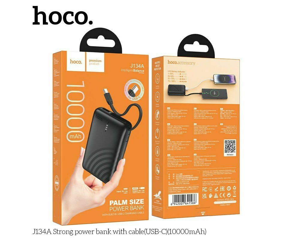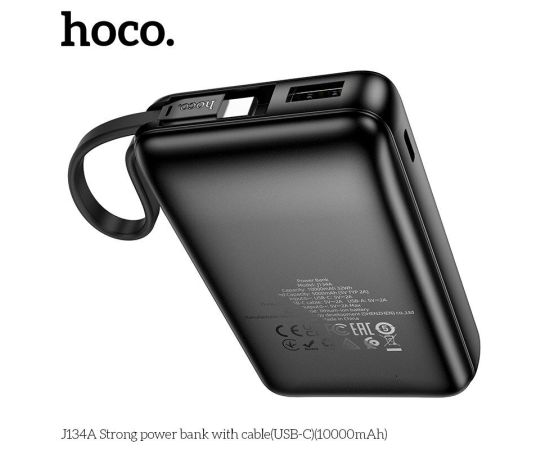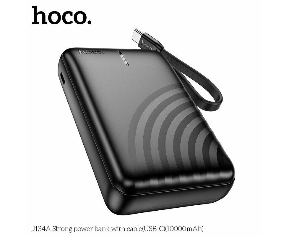 Аккумулятор внешний резервный HOCO J134A Strong с встроеными кабелем Lightning 10000mAh (черный)