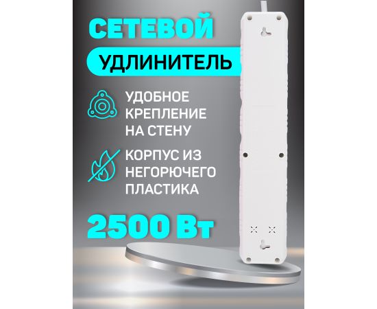 Сетевой удлинитель Amper , 4,0м, 5 розеток, 10А, 2500 Вт, 3usb, белый