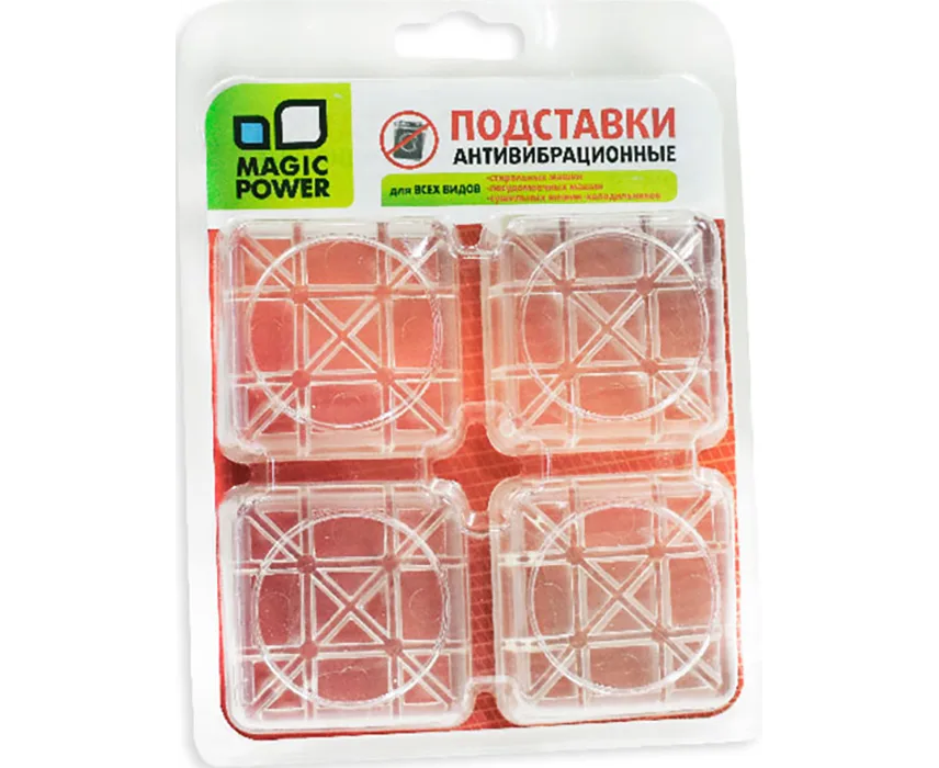 Антивибрационные подставки MAGIC POWER MP-610-1 можно использовать на любой поверхности, будь то деревянный пол или керамическая плитка. Сами подставки устойчиво фиксируются и не слетают. Предотвращение вибраций, устойчивость стиральной машины – все это обеспечивают подставки MAGIC POWER MP-610-1. В комплекте предусмотрено 4 штуки.