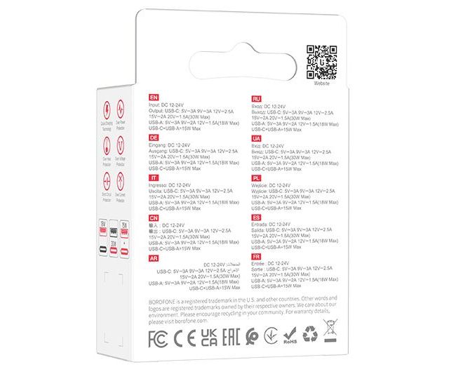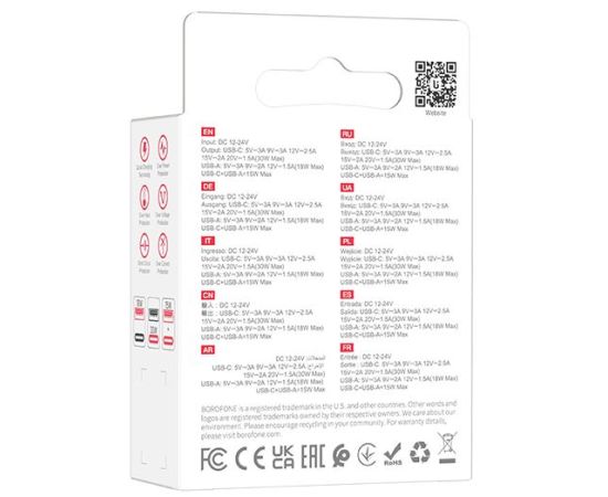 Комплектация ЗУ автомобильное BOROFONE BZ22 2 порта - USB 3.0 Type-A (18W) + 1 PD USB Type-C (30W) Quick Charger