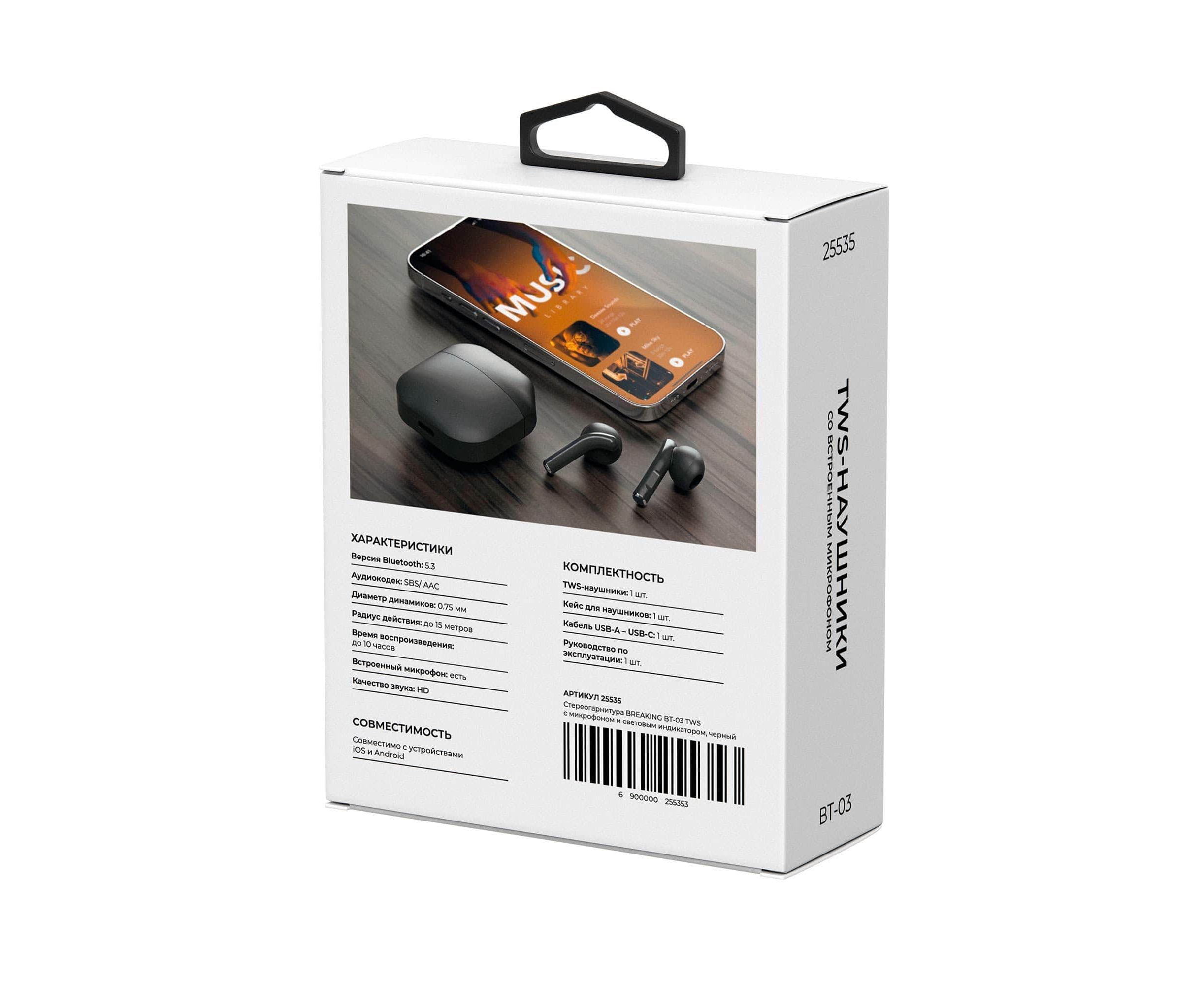 Беспроводная стереогарнитура TWS Breaking BT-03, Bluetooth 5.3 (Черный)