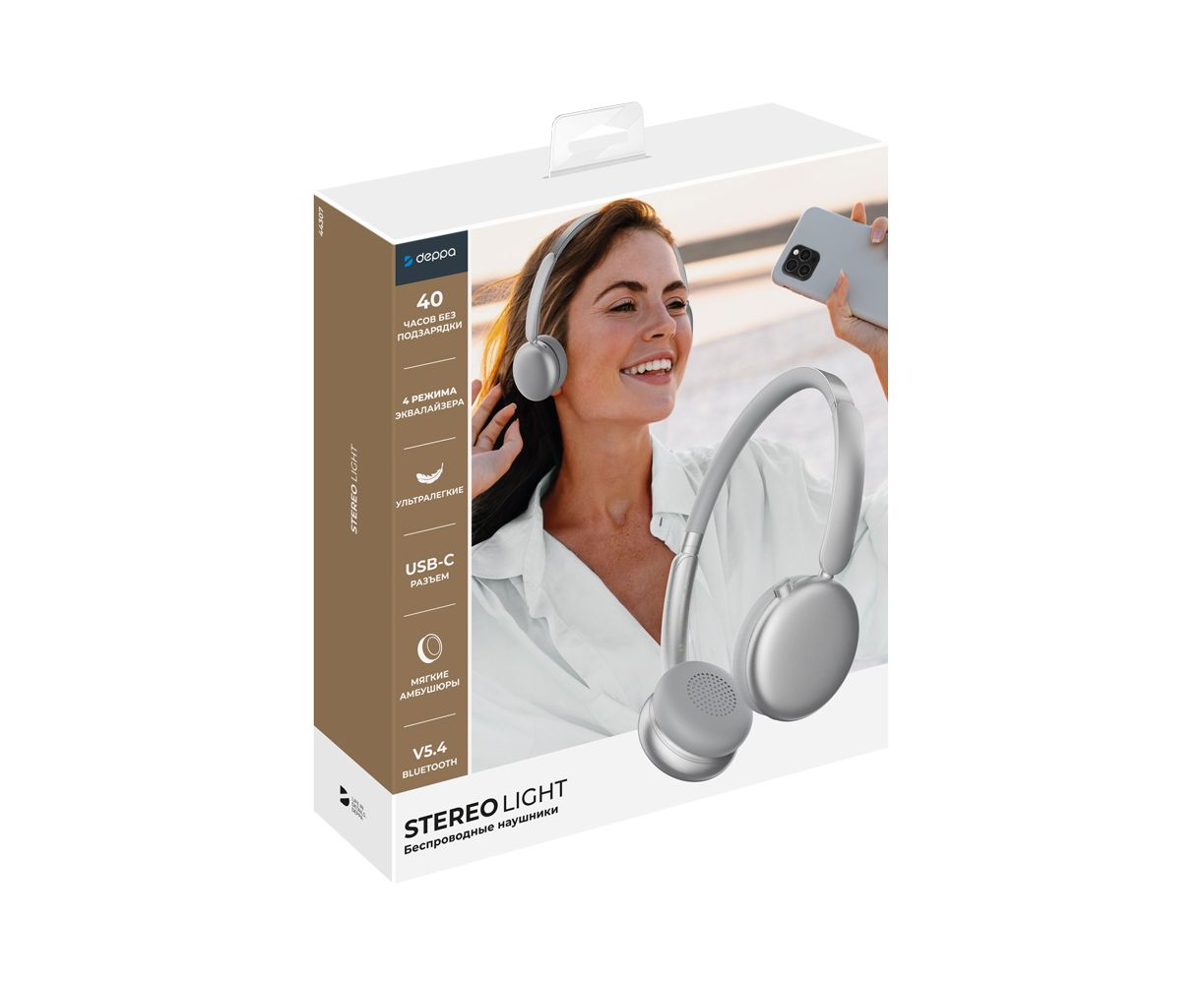 Беспроводные накладные наушники Stereo Light, BT 5.4, 300 мАч, cеребристый, Deppa