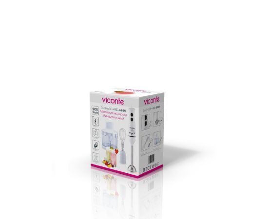 Погружной блендер Viconte VC4449 900 W, Погружной блендер, мощность 900 W, современный эргономичный дизайн, пульсовый режим работы, 2 скорости, лезвия из нержавеющей стали, металлическая нога блендера, венчик для взбивания, чаша с ножом для рубки и измельчения, 500 мл; автоматическая блокировка при неправильно установленной насадке, удобство и простота в обращении и чистке.
