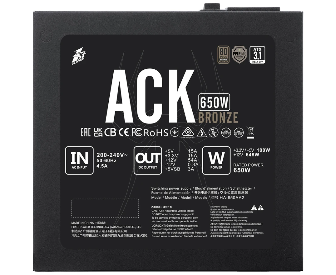 Блок питания 1STPLAYER Ack Bronze 650W Black (HA-650AA2) / ATX 3.1, APFC, 80 PLUS Bronze, Double Forward, 140mm fan, non-modular / HA-650AA2