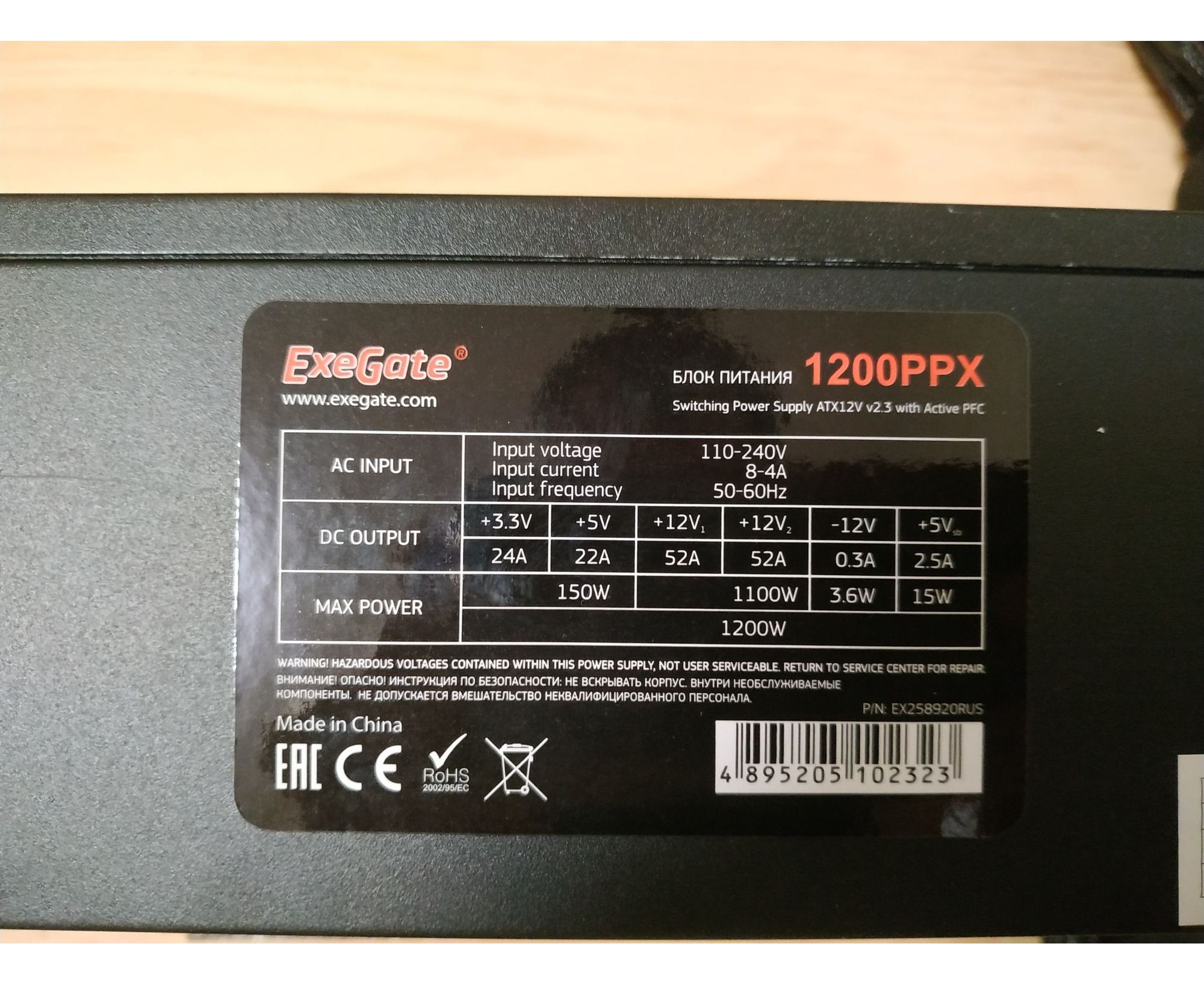Блок питания Exegate 1200PPX EX258920RUS 1200W RTL, ATX, black, active PFC, 14cm, 24p+2*(4+4)p