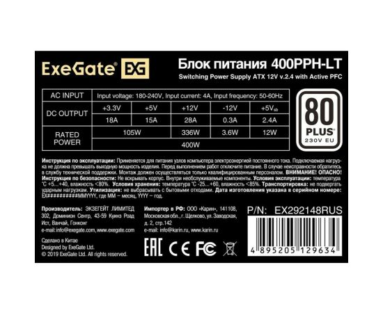 Блок питания ExeGate 400PPH-LT-OEM (EX292148RUS-OEM) 400W ATX, APFC, КПД 82% (80 Plus), 12cm fan, 24pin, (4+4)pin, PCIe, 5xSATA, 3xIDE, black