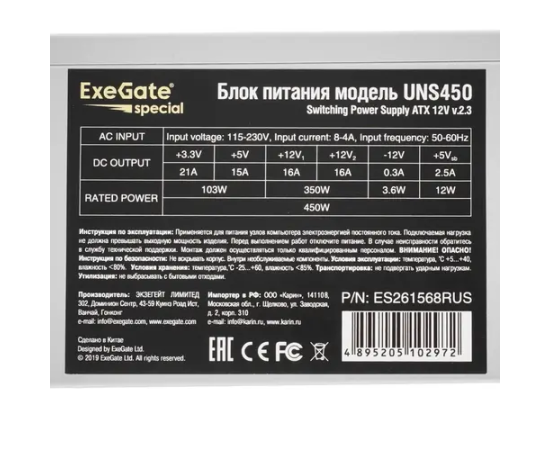 Блок питания ExeGate ES261568RUS-PC 450W UNS450, ATX, PC, 12cm fan, 24p+4p, 6/8p PCI-E, 3xSATA, 2xIDE, FDD + кабель 220V