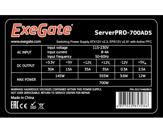 Блок питания Exegate EX174460RUS 700W Exegate APFC OEM,2 х 8 cm fan, 20+4pin/(4+4)pin+(4+4)pin , 2xPCI-E , 9xSATA ((Server) PRO) [252873]