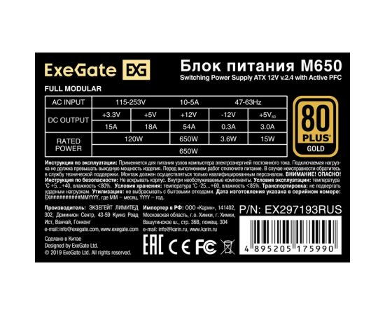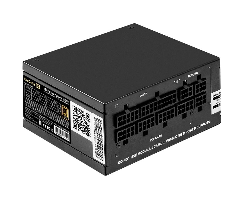 Блок питания Exegate M650 Gold EX297193RUS 650W (SFX, APFC, КПД 90проц. (80 Plus Gold), 9cm fan, 24pin, (4+4)pin, 2xPCI-E, 6xSATA, 3xIDE, 1xFDD)