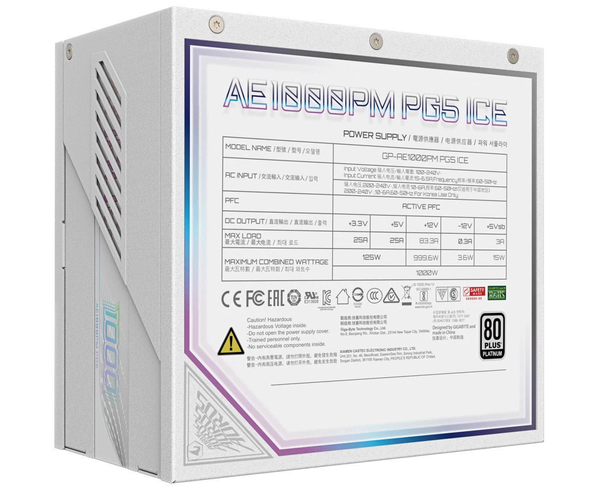 Блок питания Gigabyte AE1000PM PG5 Ice 1000W (GP-AE1000PM PG5 ICE), 80Plus, Platinum, Полностью модульный, PCIe Gen 5.1, ATX 3.0 compatible