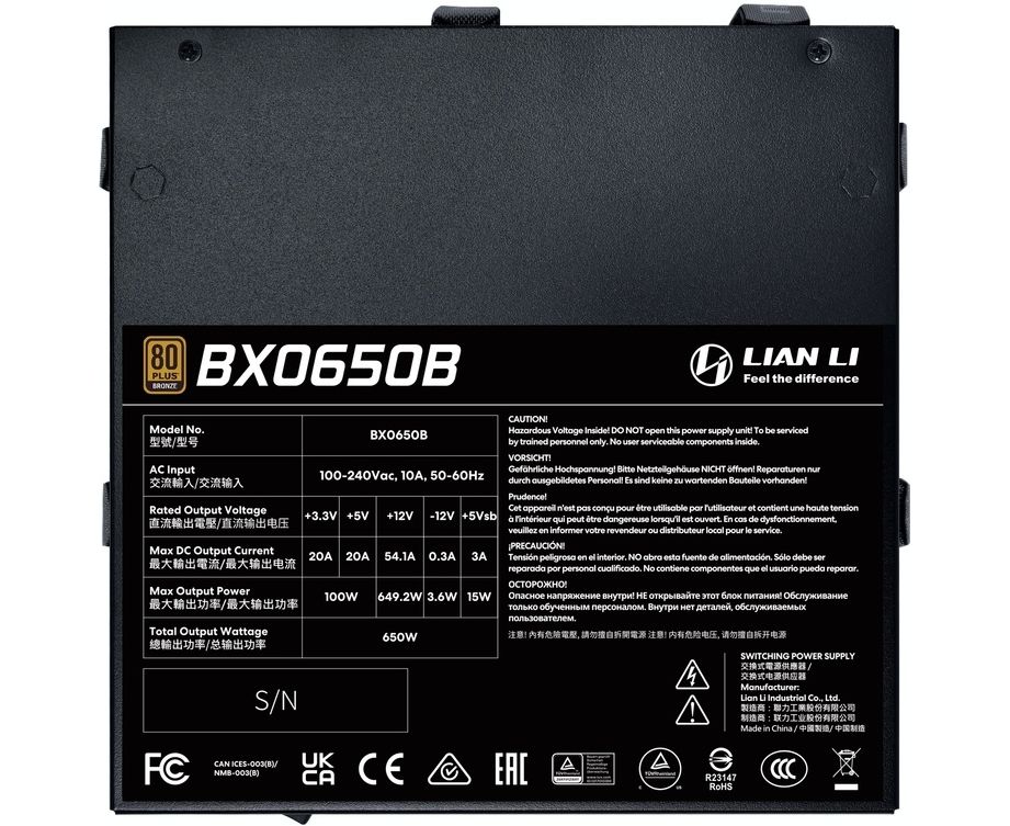 Блок питания Lian Li BX0650B (G9P.BX0650B.B000.RU) / Black / ATX 3.1, 650W, 80 Plus Bronze, PCIe 5.1, APFC, DC-DC, 135mm FDB Fan, Non Modular