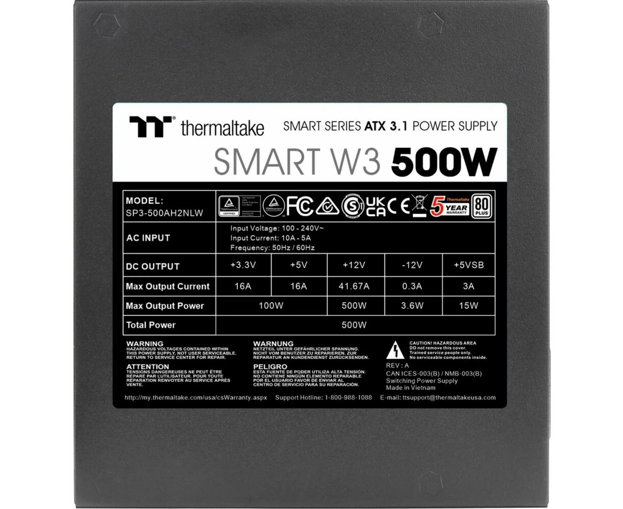 Блок питания Thermaltake Smart W3 500 (PS-SPW-0500NNFAWE-1) /Non Modular/Non Light/Full Range/Analog/80 Plus/EU/Non JP CAP