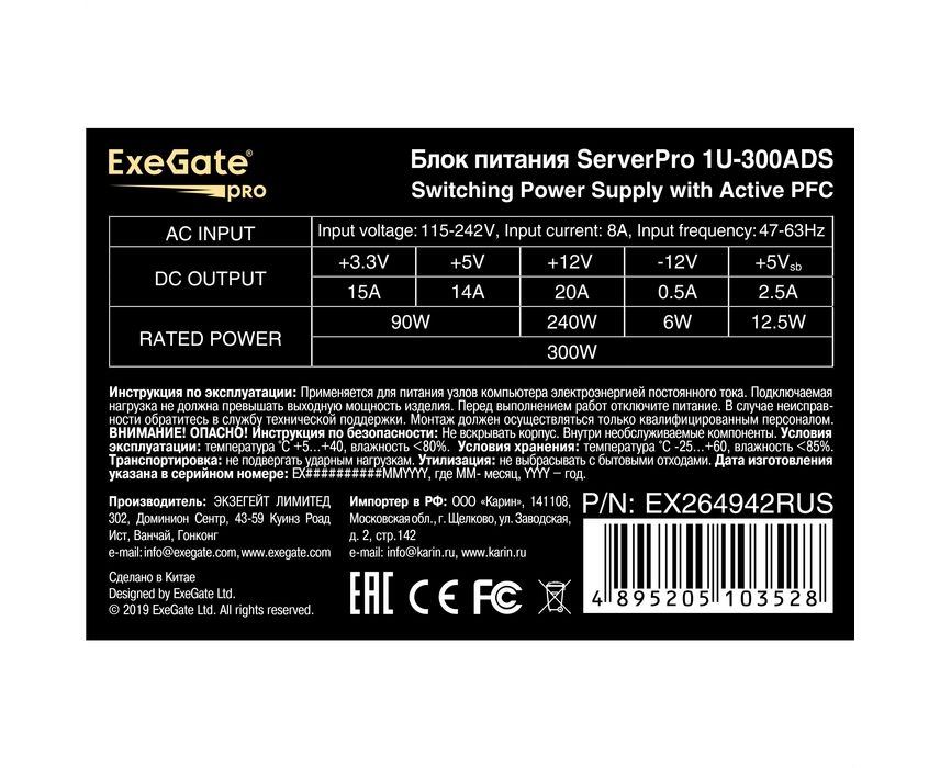 Блоки питания Exegate ServerPro-1U-300ADS EX264942RUS 300W APFC, унив. для 1U, 24pin,2x(4+4)pin,3xSATA,3xIDE