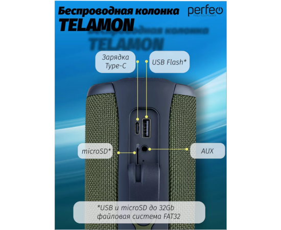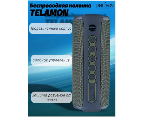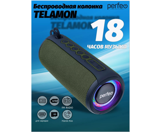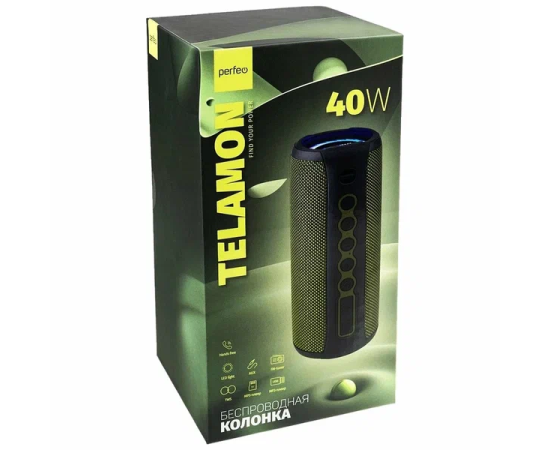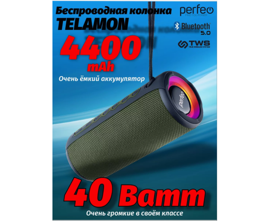 Блютуз колонка Perfeo "TELAMON" FM, MP3 USB/TF, AUX, TWS, LED, HF, 40Вт, 4400mAh, зелёный
