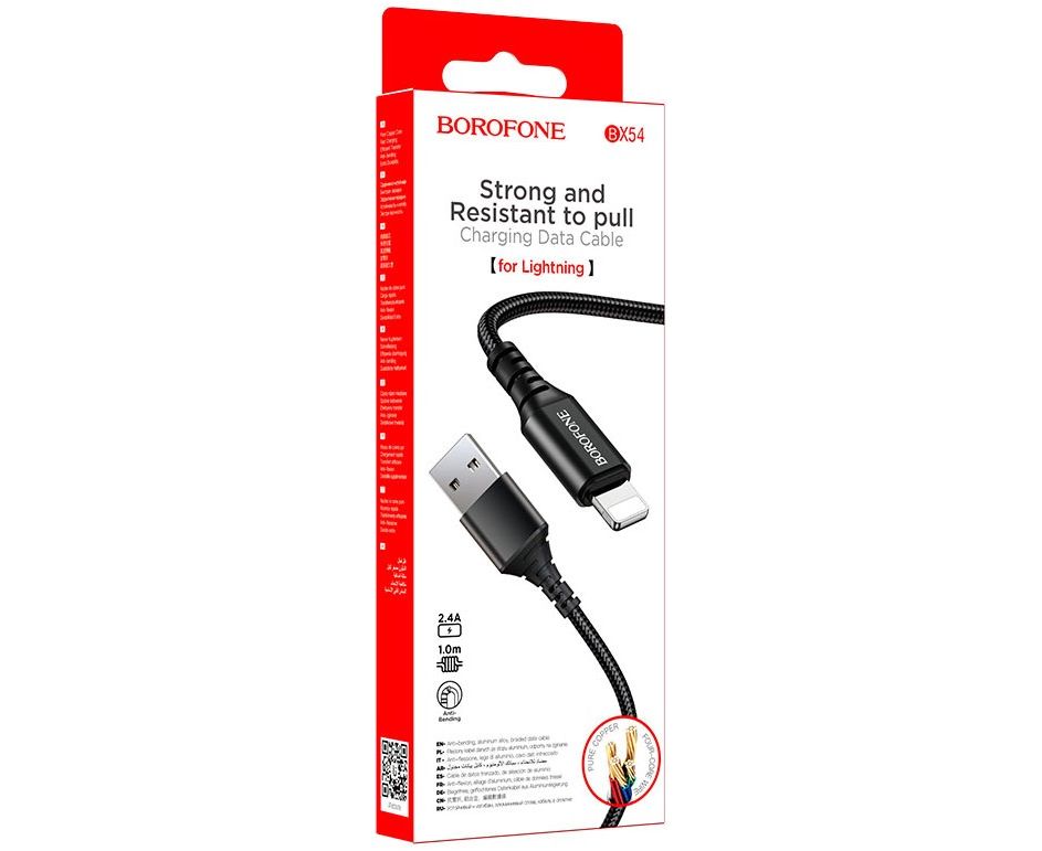 Кабель BOROFONE BX54/ USB Lightning/ 1m/ 2.4A/ Нейлон/ черный
