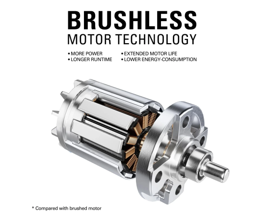 Интеллектуальная технология бесщеточных TRU. В 2 раза больший крутящий момент. Обеспечивает большую мощность, более длительное время работы, бесшумную работу и длительный срок службы двигателя