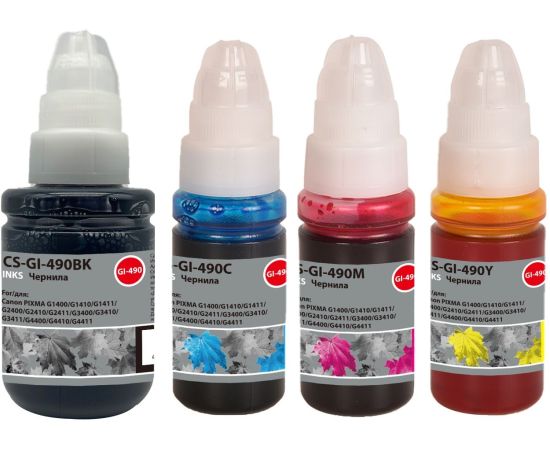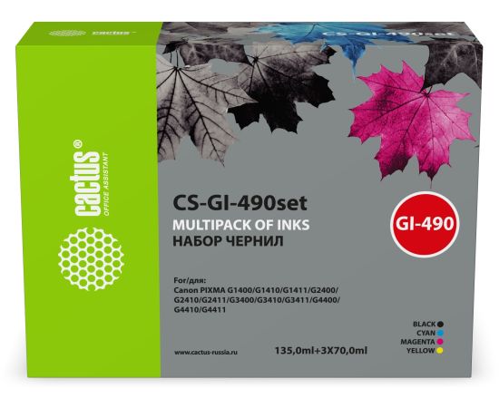 Чернила Cactus CS-GI-490SET (1х135мл, 3х70мл) голубой/пурпурный/желтый/черный набор для Canon PIXMA G1400/G1410/G1411/G2400/G2410/G2411/G3400/G3410
