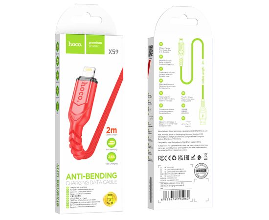 Дата-кабель USB 2.4A для Lightning 8-pin Hoco X59 нейлон 2м (Red)