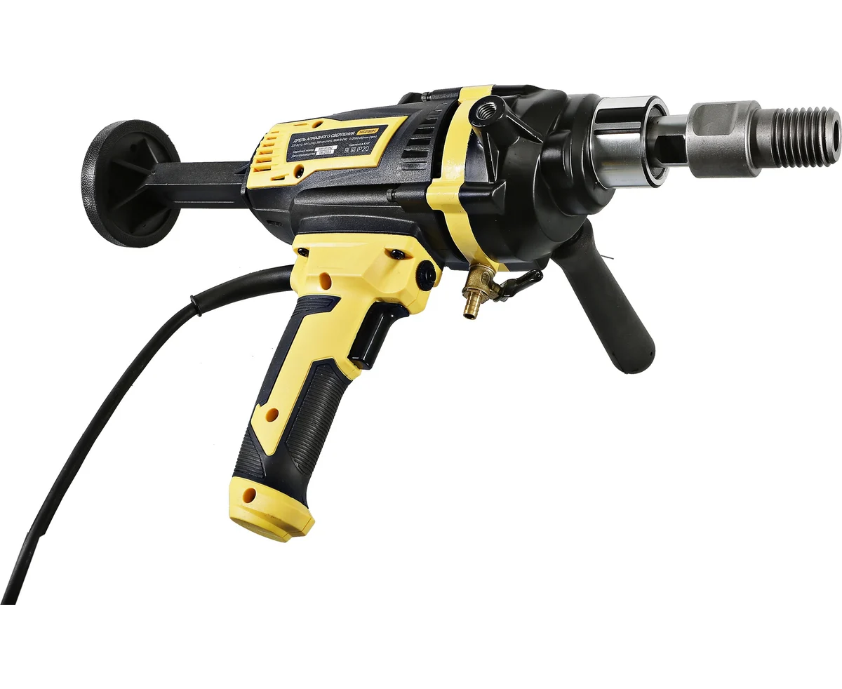 Дрель алмазного сверления Hanskonner HID2180M — компактный и мощный электроинструмент с надежной конструкцией для сверления алмазными коронками отверстий в таких материалах: бетон, железобетон, искусственный и натуральный камень, кирпич. Подключив инструмент к водопроводному крану можно сократить запыленность рабочей зоны, а также износ алмазных коронок и дрели. Данная модель оснащена предохранительной муфтой, срабатывающей при заклинивании коронки, и термозащитой работающей при других видах перегруженности.
