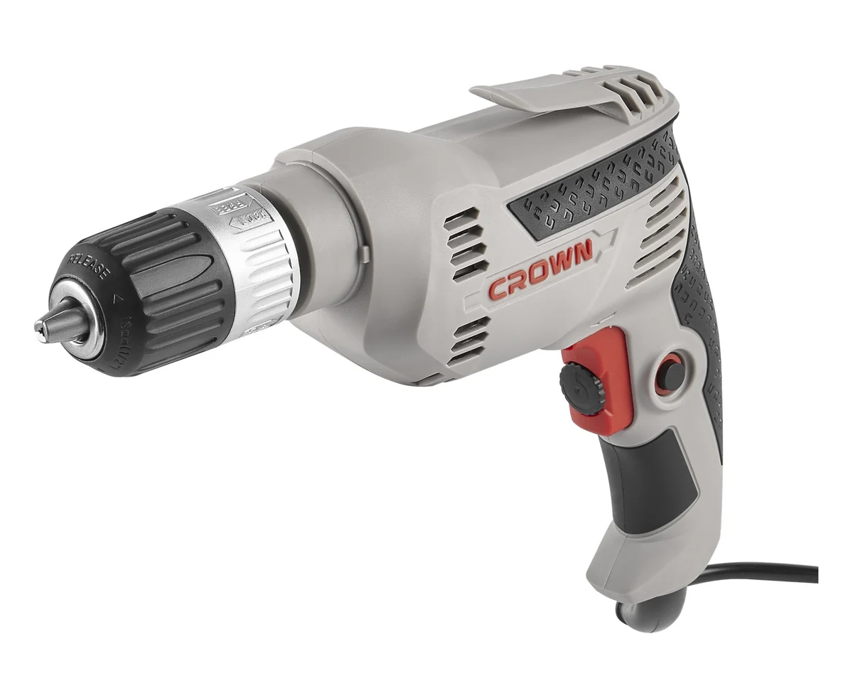 Для работ с разными материалами и с разнообразной оснасткой, дрель Crown CT10143-13C оснащена регулировкой частоты вращения с помощью встроенного в клавишу выключателя регулятора с 10-ю ступенями регулировки.