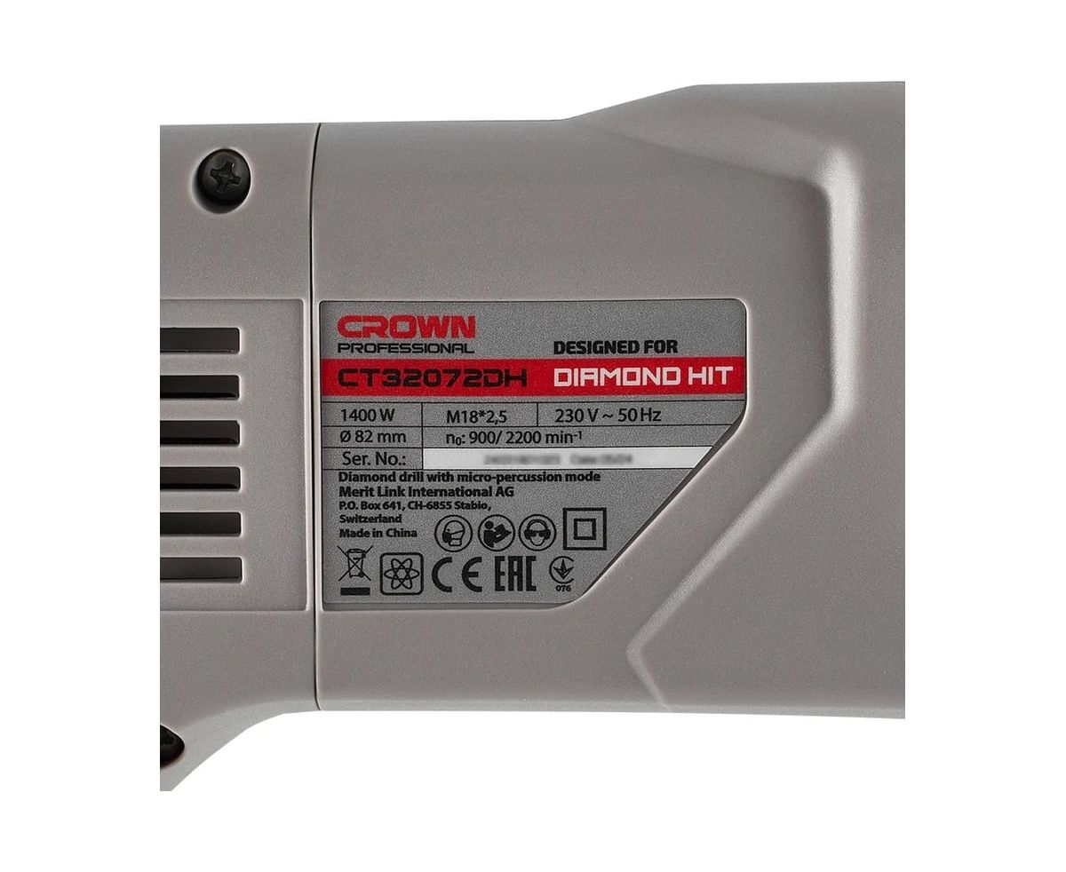 Ручная дрель с микроударом Crown CT32072DH BMC предназначена для сухого алмазного сверления отверстий алмазными коронками в бетоне, железобетоне, камне, кирпиче, натуральном камне и в прочих абразивных материалах во время проведения общестроительных работ, отделочных работ, электромонтажных работ, монтажа сантехники, монтажа вентиляции, установки систем вентиляции и кондиционирования, прокладке труб, при проведении дорожных работ, отбора проб и т.д.