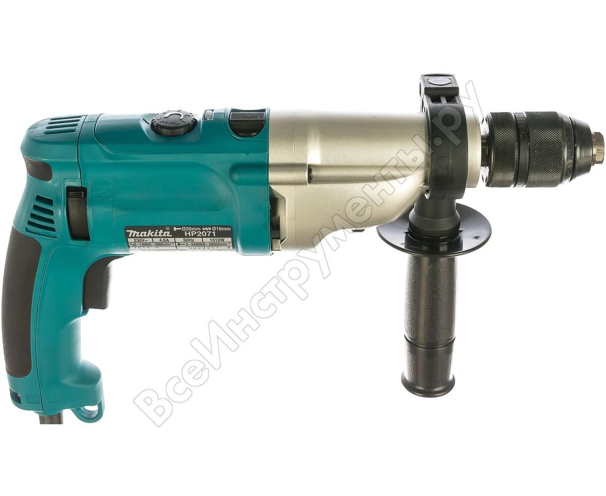 Двухскоростная ударная дрель Makita HP 2071 имеет два режима работы: сверление и ударное сверление.