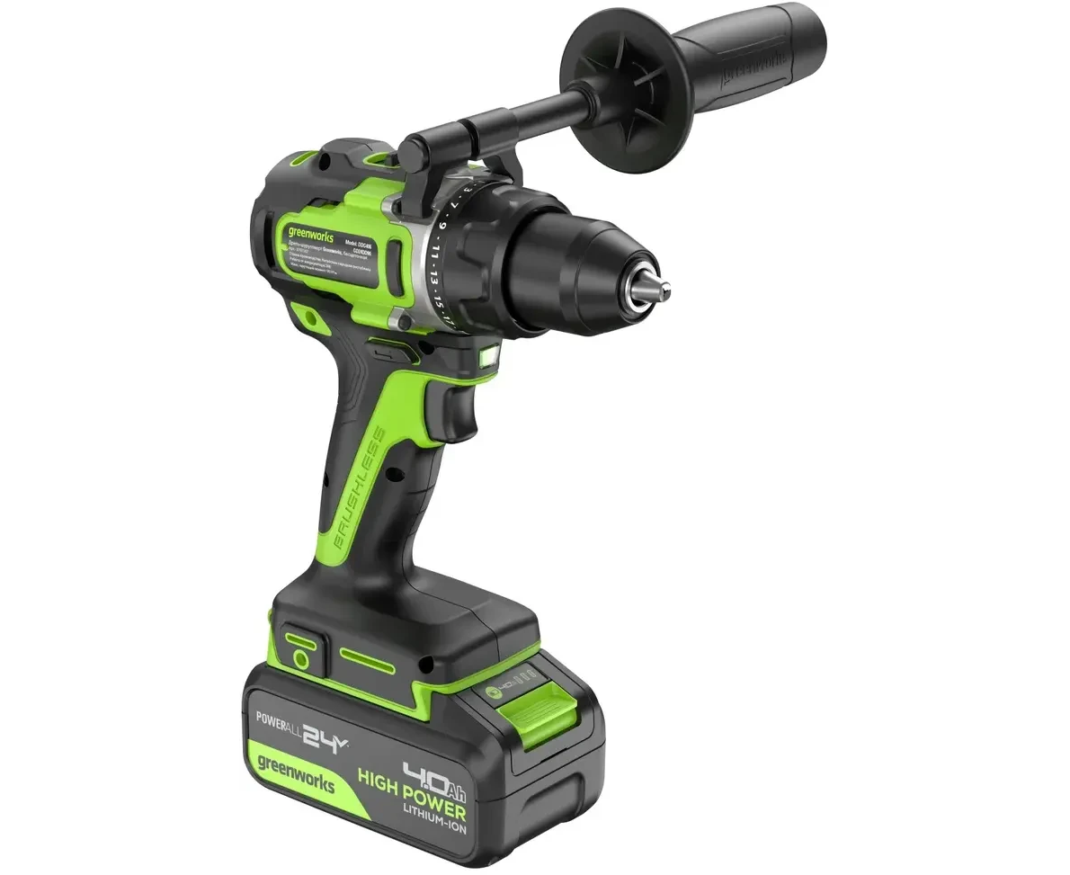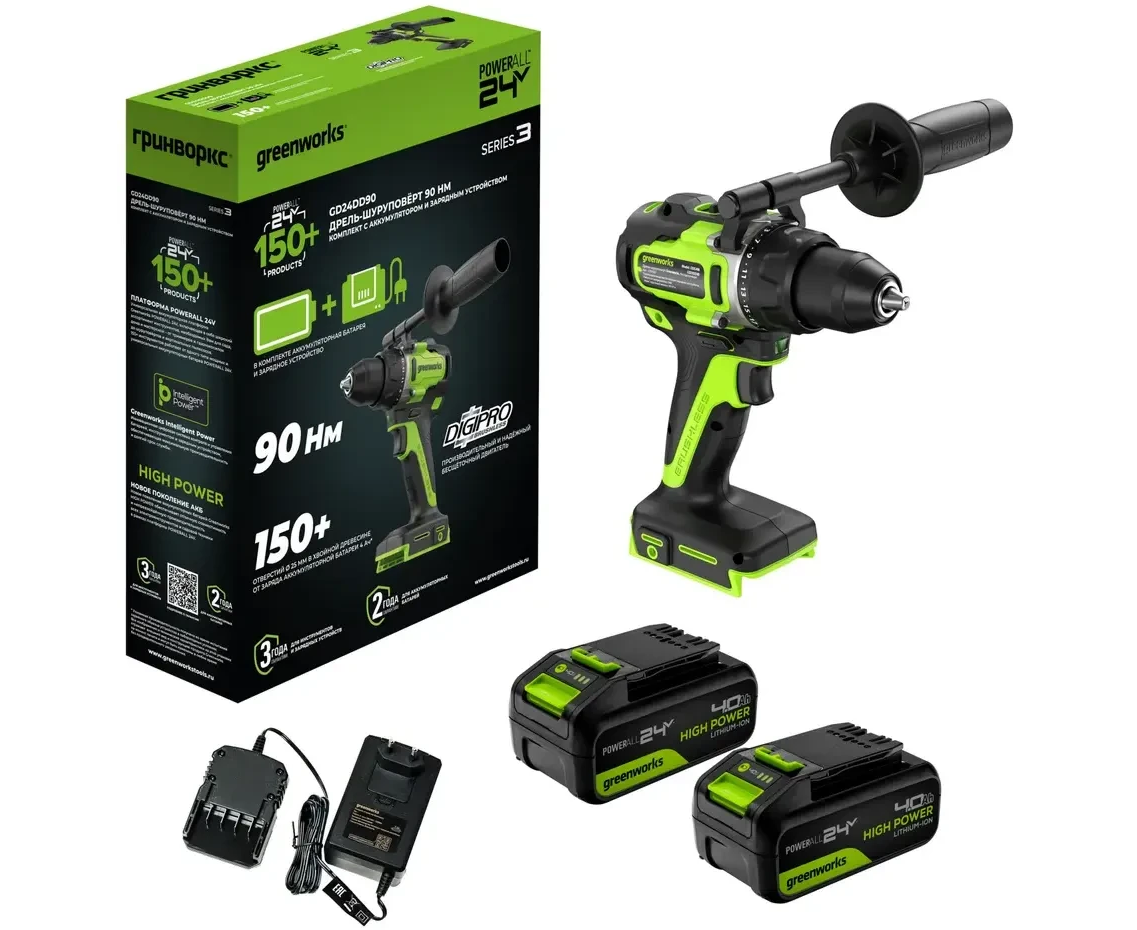 Дрель-шуруповерт Greenworks GD24DD90 (3707507CUD) аккумуляторная, 24V, 90Нм, бесщеточная, 45/90Нм, 2х4Ач, ЗУ, кор