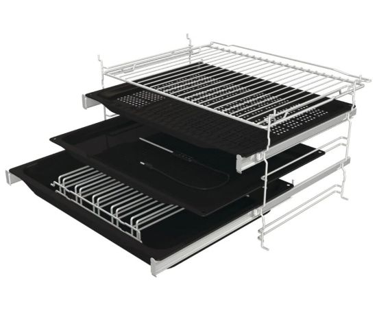 глубокий эмалированный противень, мелкий эмалированный противень, 1 перфорированный эмалированный противень, решетка, термозонд для мяса, частично выдвижные телескопические направляющие на 2-х уровнях, резервуар для воды: 0.13 л