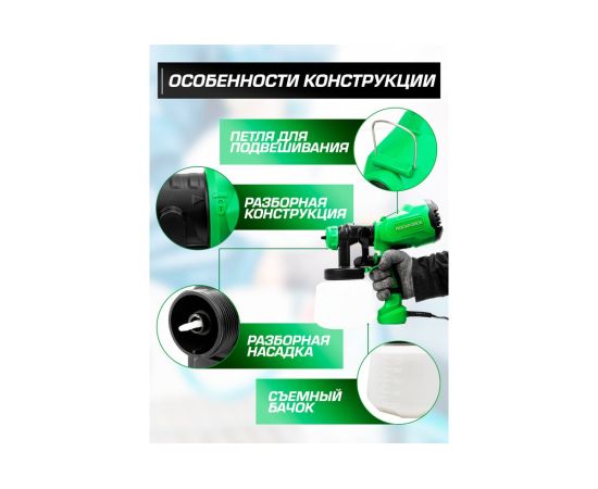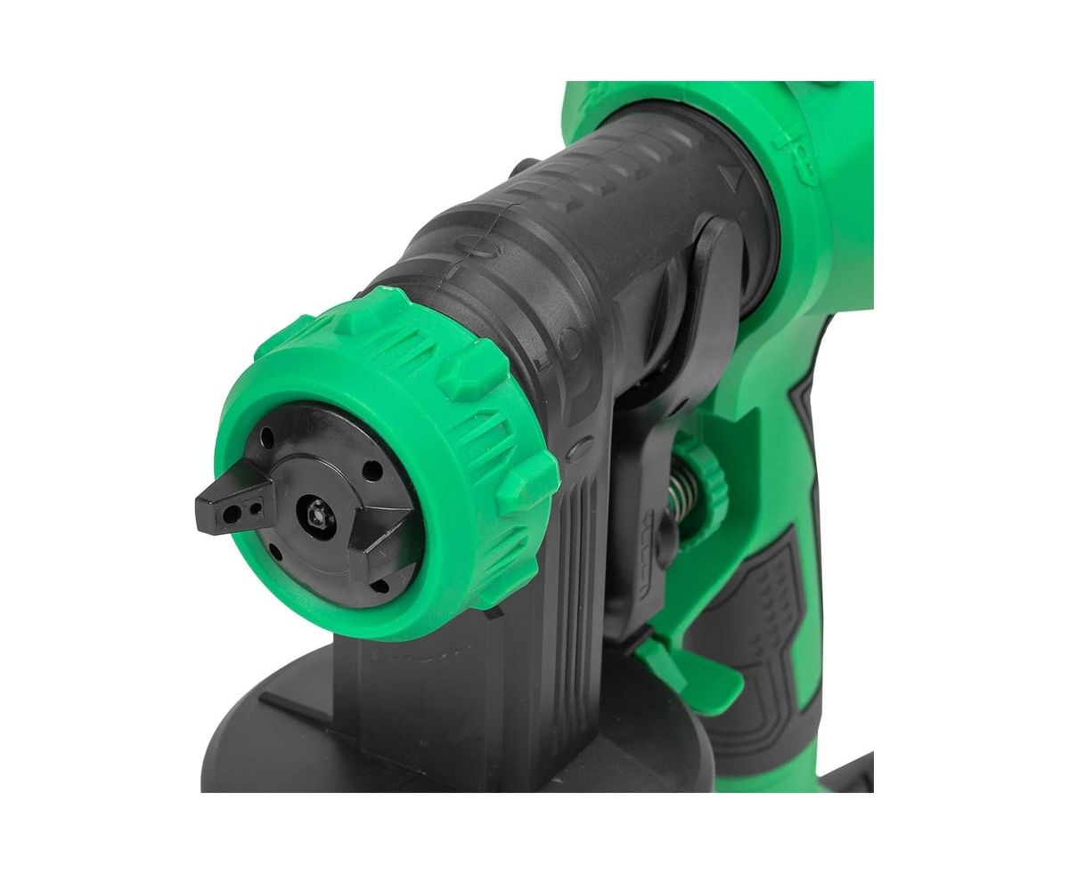 Удобство использования. Под давлением встроенного насоса из малярного инструмента выделяется краска. С помощью краскопульта электрического можно наносить побелку, полироль, морилку, грунтовку, лак, масло и многое другое. Сопло плотно прилегает к конструкции аппарата без зазоров, что защищает от подтеков. Также краскопульт оборудован винтом для регулировки расхода краски. Краскопульт имеет 3 варианта распыления, который выбирается благодаря вращению подвижной части распылительной головки: вертикальный и горизонтальный овал или круг. Воздушный тип двигателя электрокраскопульта обеспечивает качественную покраску: лакокрасочные материалы наносятся тонким и равномерным слоем.