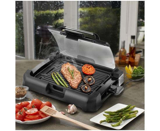 Накрывается гриль крышкой из закалённого стекла, через неё можно наблюдать за процессом приготовления. Удобная ручка не нагревается. Крышка фиксируется в верхнем положении, поэтому вам не придётся её снимать и искать дополнительное место на столе.
