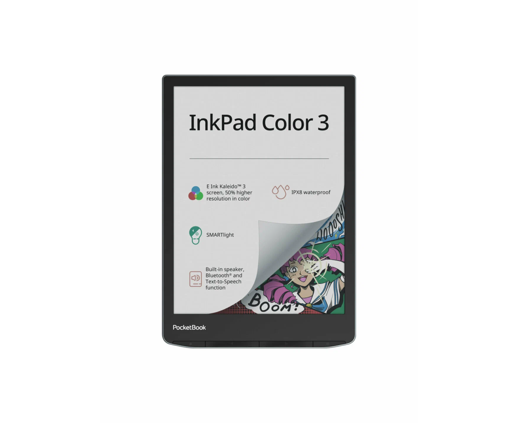 PocketBook 743K InkPad Color 3 защищен по стандарту IPX8, что позволяет читать у бассейна, на пляже или в ванной без опасения повредить устройство.