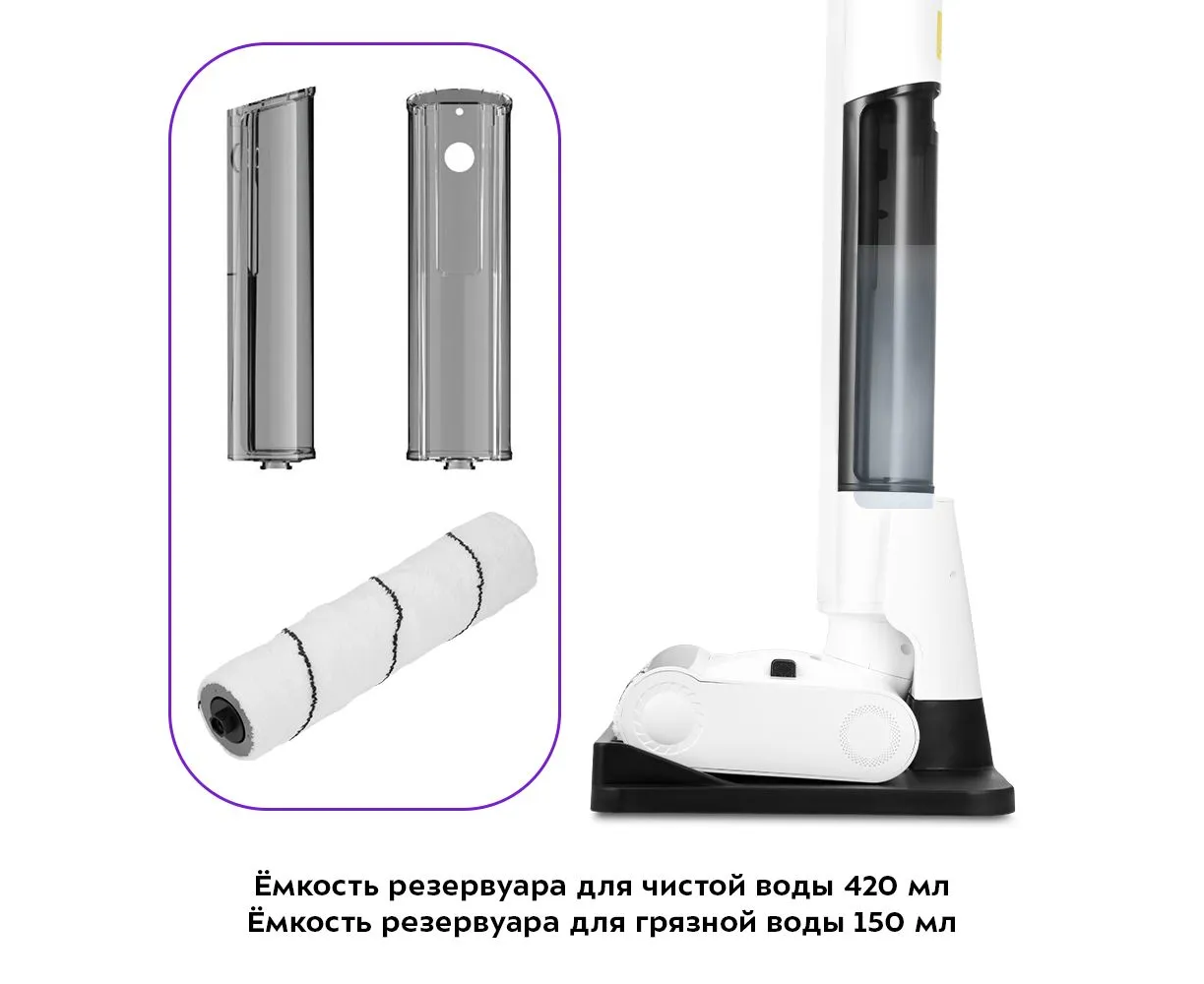 Резервуары для чистой и грязной воды съёмные, так что заливать воду и очищать прибор очень легко. Ёмкость резервуара для чистой воды 420 мл, для грязной — 150 мл. В комплект входят два валика, один из них является запасным.