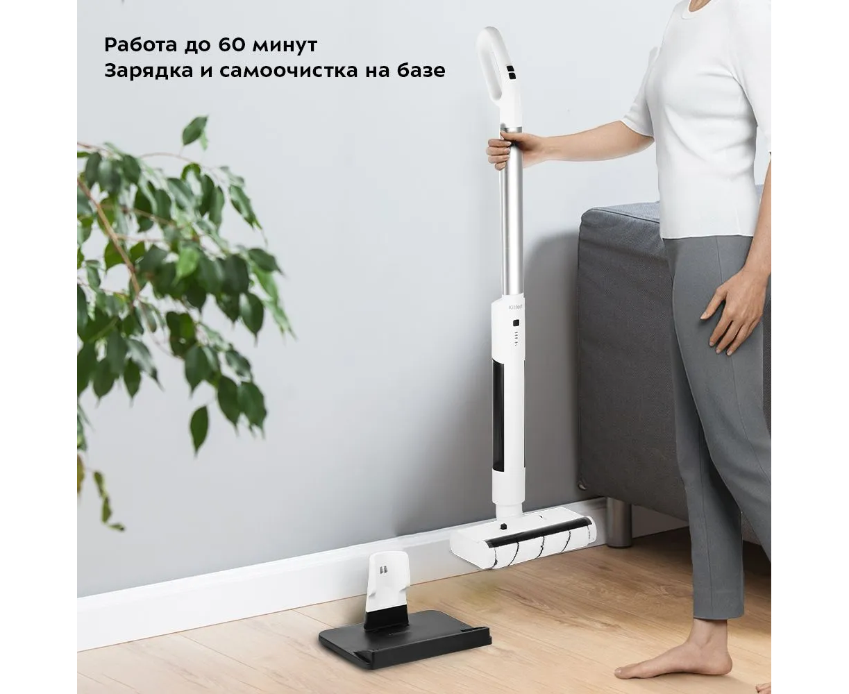 Для зарядки и самоочистки прибор устанавливается на базу. Электрошвабра работает от аккумулятора до 60 минут. Когда швабра подключена к сети, индикаторы показывают уровень зарядки прибора. Нажатие на кнопку самоочистки запускает эту функцию.