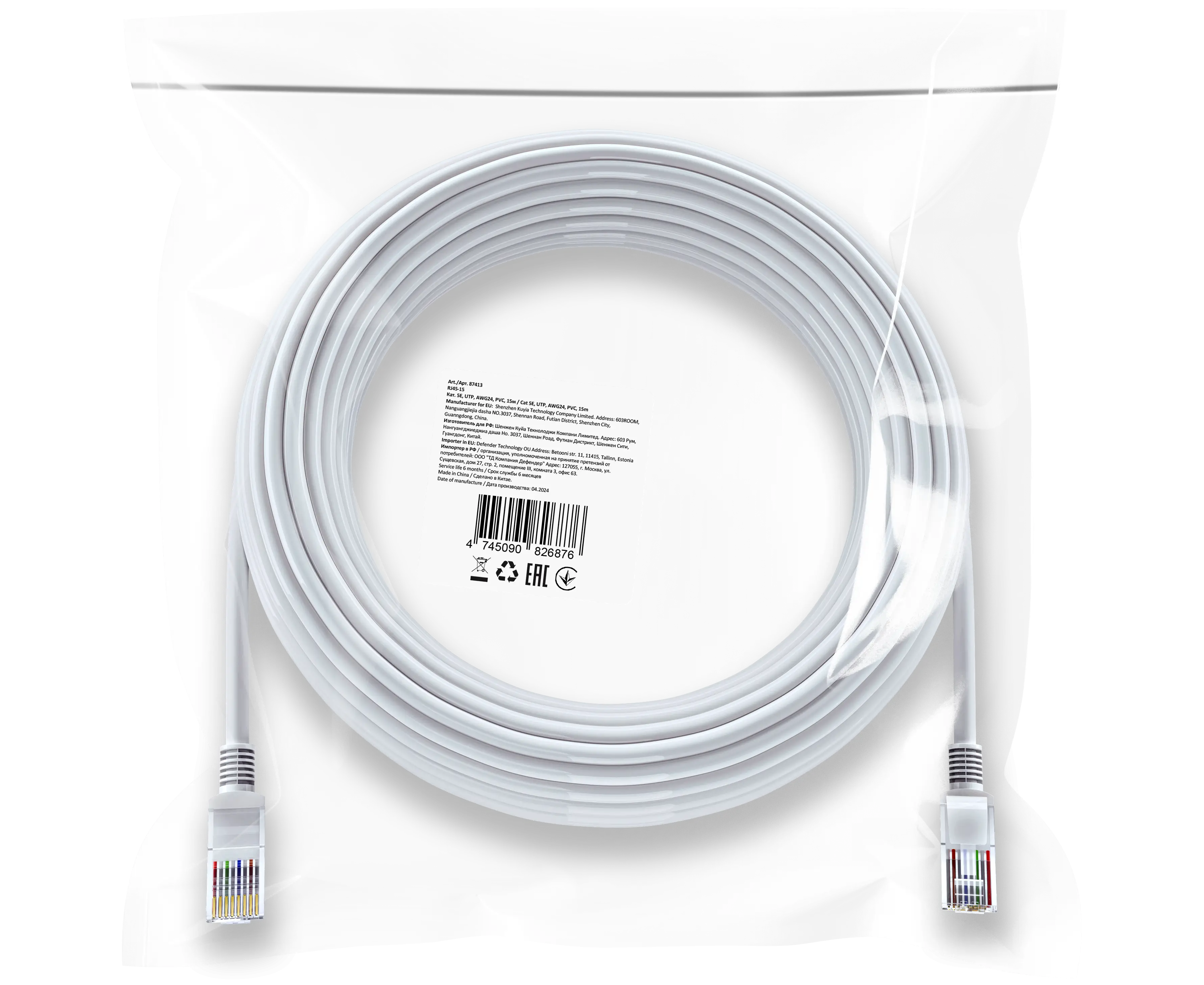 Ethernet кабель DEFENDER RJ45-15 Cat 5E, UTP, AWG24, PVC, 15м 87413