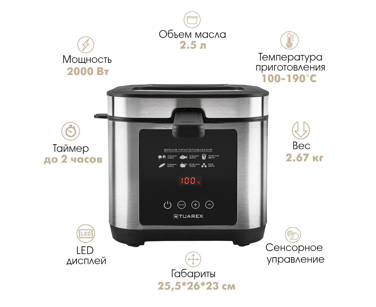 Регулировка температуры приготовления, Сенсорное управление, LED дисплей, Таймер до 2 часов, Корзина для фритюра с ручкой, Антипригарное покрытие чаши, Защита от перегрева, Съемная крышка, Прозрачное окошко на крышке, Индикатор работы