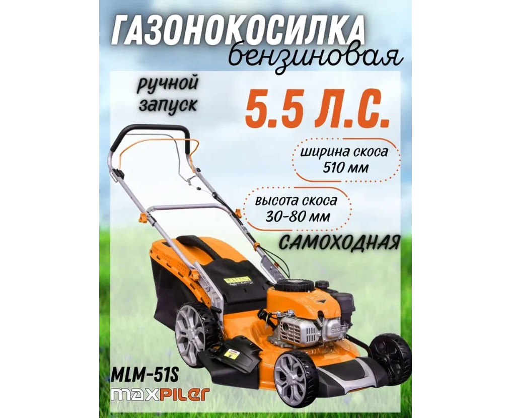 Газонокосилка бензиновая Maxpiler MLM-51S (самоход.5,5л.с, диам. кош 510мм, высот кош 30-80мм, 70л)