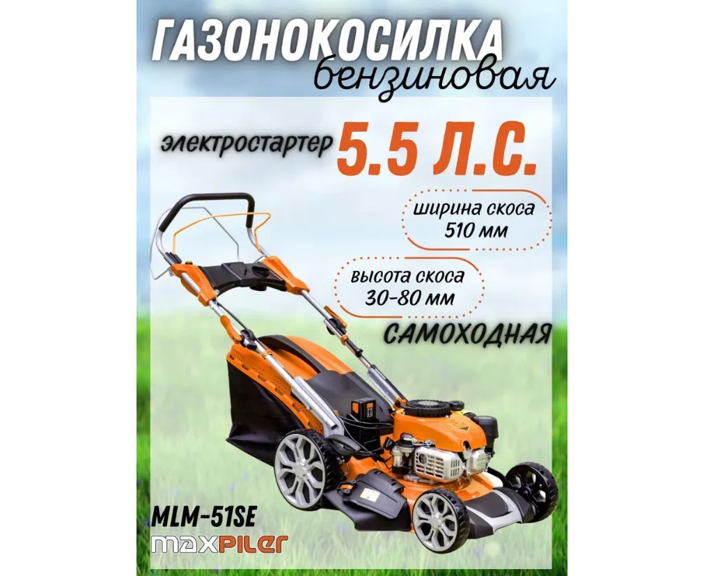 Газонокосилка бензиновая Maxpiler MLM-51SE (эл.старт, самоход,5,5 л.с, диам. кош 510мм,высот кош 30-80мм,70л)