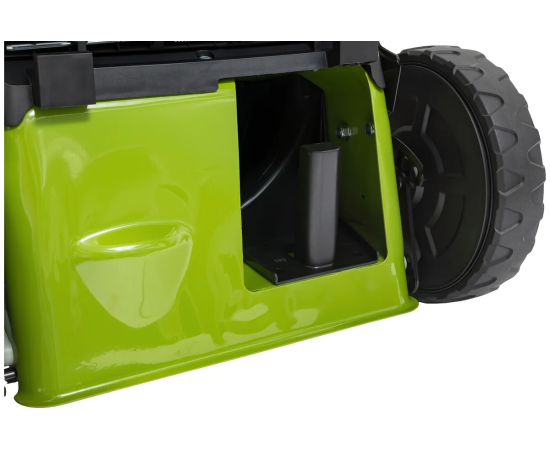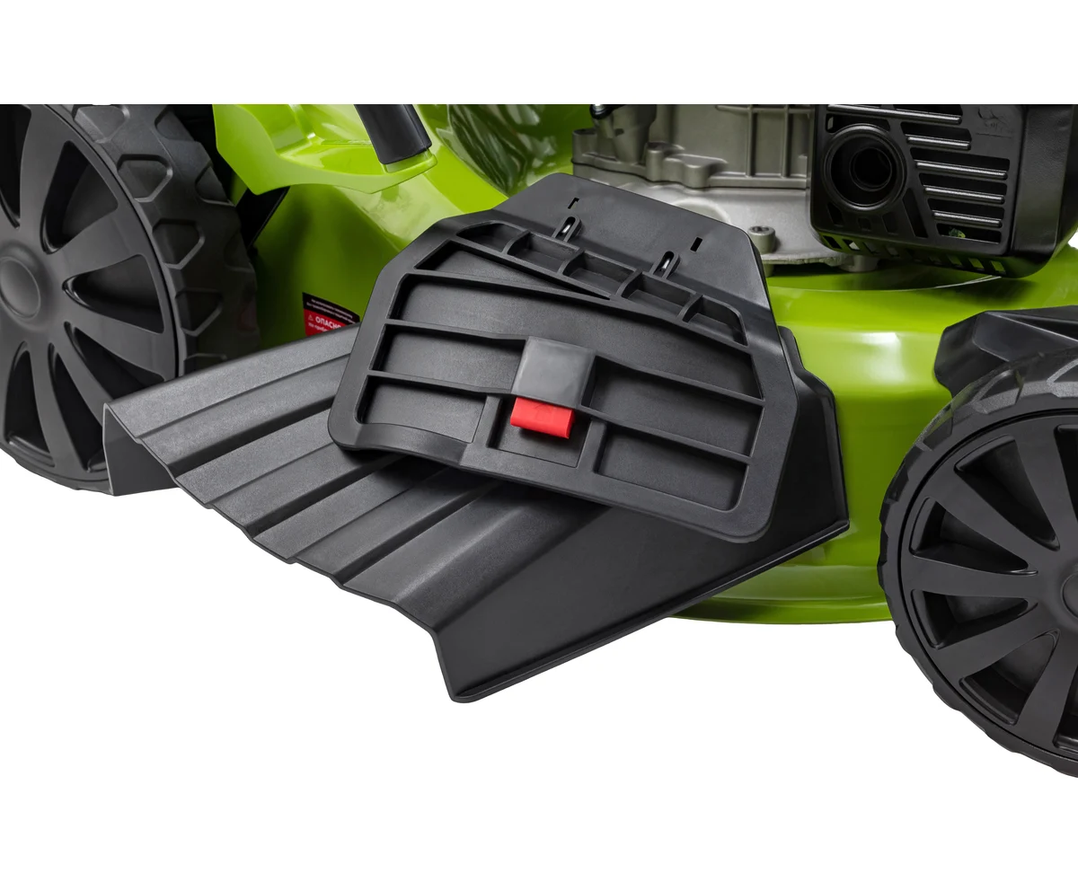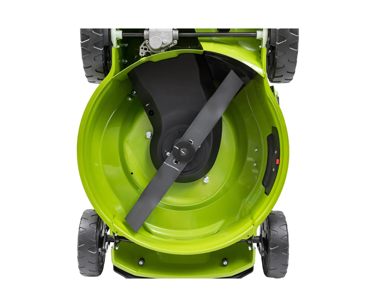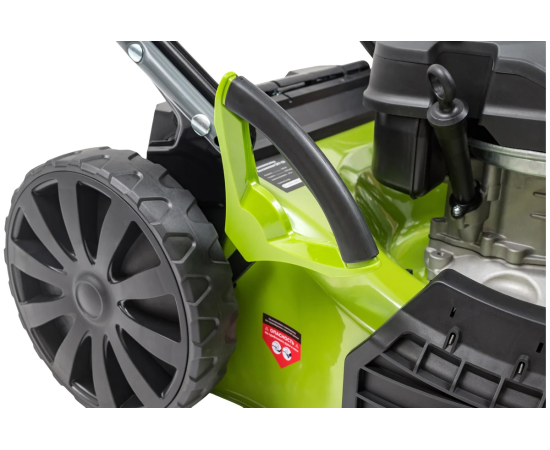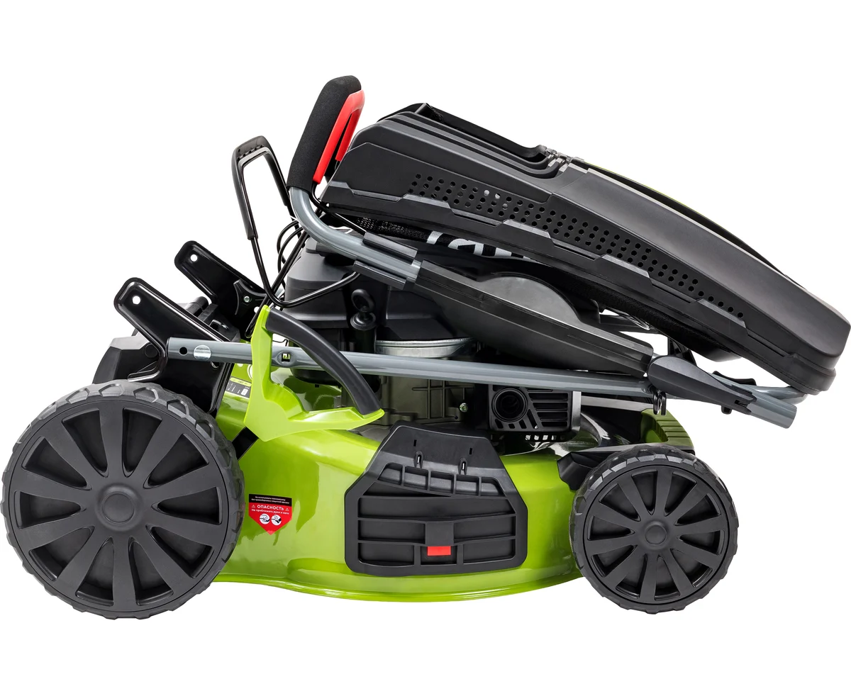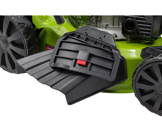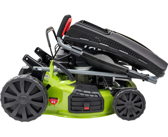 Центральная регулировка высоты скашивания с шестью режимами позволяет настроить высоту от 25 до 75 мм, что делает ее универсальной для различных типов газонов. Мульчирование способствует улучшению состояния почвы, а стальной корпус обеспечивает долговечность и устойчивость к повреждениям. Складная ручка облегчает хранение и транспортировку, а большие задние колеса повышают проходимость на неровных участках.