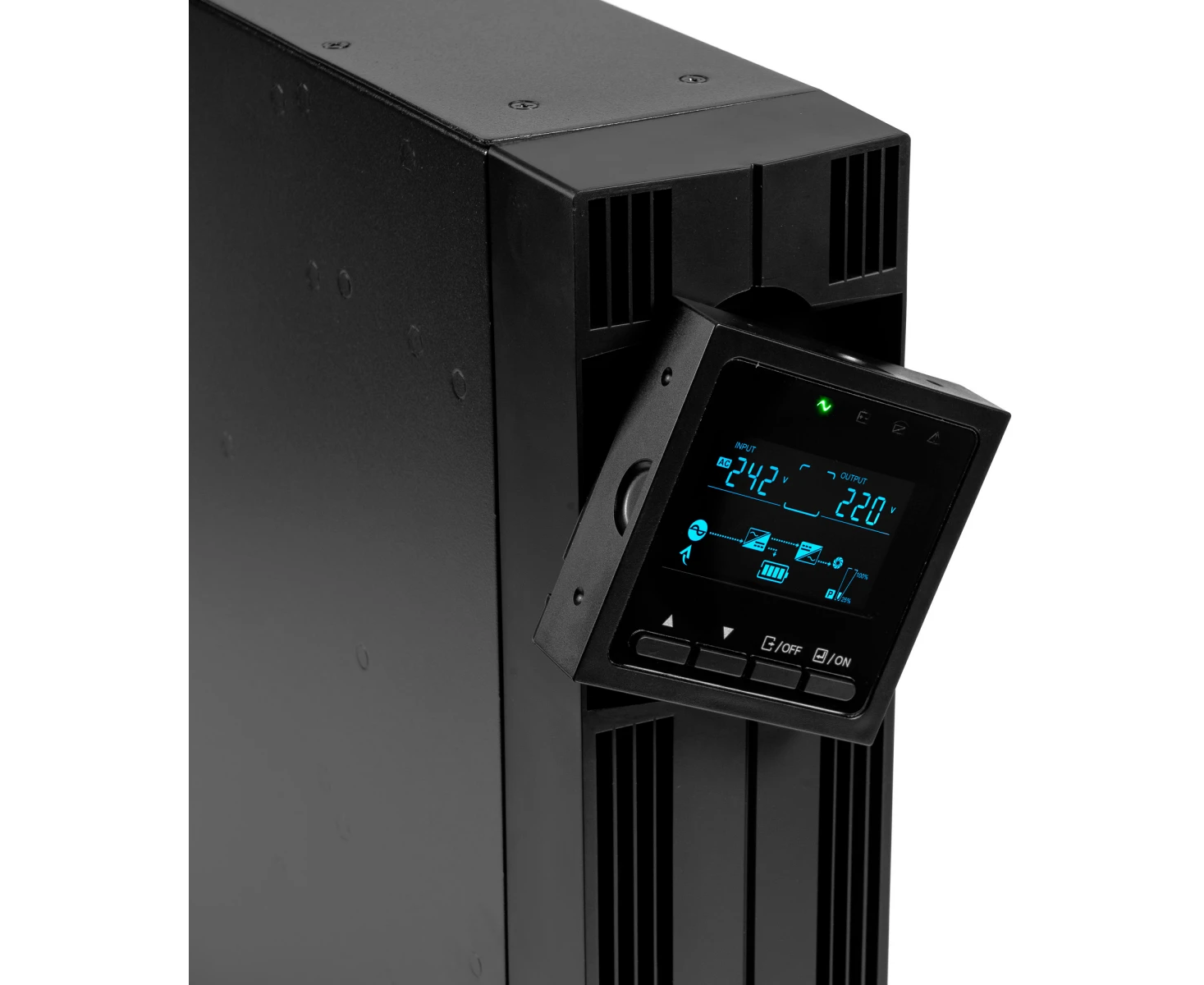 Управление и мониторинг удобно осуществлять с помощью информативного жидкокристаллического экрана на лицевой панели. Для интеграции в систему управления доступны встроенные интерфейсы: Ethernet, RS-232 и USB, а также специальный слот для установки дополнительной SNMP-карты, позволяющей осуществлять удаленный контроль по сети. Устройство выполнено в классическом черном цвете, имеет компактную высоту 2 стандартных юнита для монтажа в стойку и отличается умеренным уровнем шума около 55 децибел. Функция холодного старта позволяет запустить оборудование от батарей даже при полном отсутствии сетевого напряжения, что может быть критически важно в нештатных ситуациях.