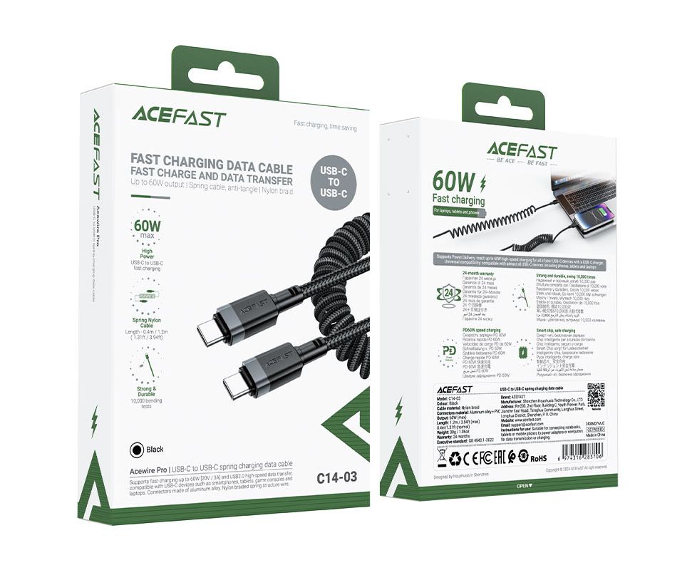 ACEFAST C14-03 60 Вт USB-C — пружинный кабель для зарядки USB-C.