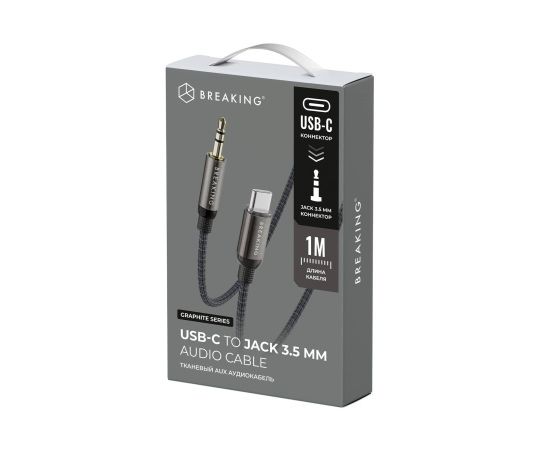Кабель AUX Breaking Graphite, USB-C - AUX соединяющий разъем USB-C с аудиовыходом формата AUX, предназначен для подключения совместимых мобильных устройств к автомобильной акустике, домашним стереосистемам или другим устройствам с входом AUX.
