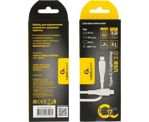 Кабель CABLEXPERT CCB-USB2-CMAPO1-2MW USB2.0 Type-C-Lightning, 2м 2.1 А, 20Вт, PD, медь, белый
