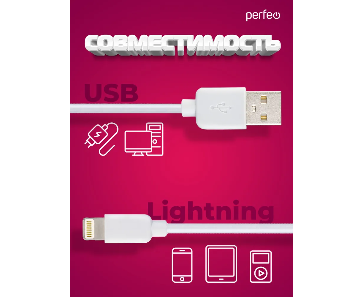 Кабель для iPhone PERFEO I4604 USB-8 PIN Lightning белый, 1м, бокс