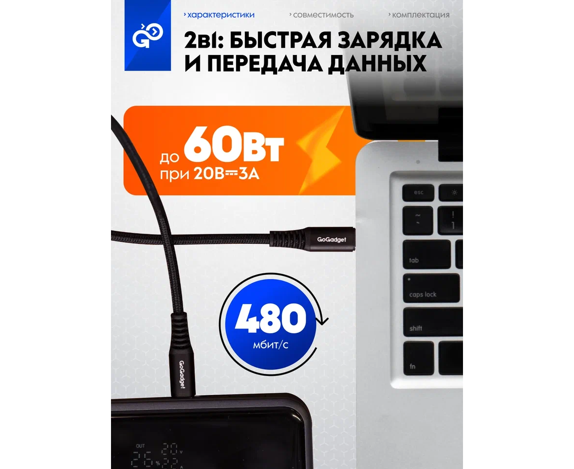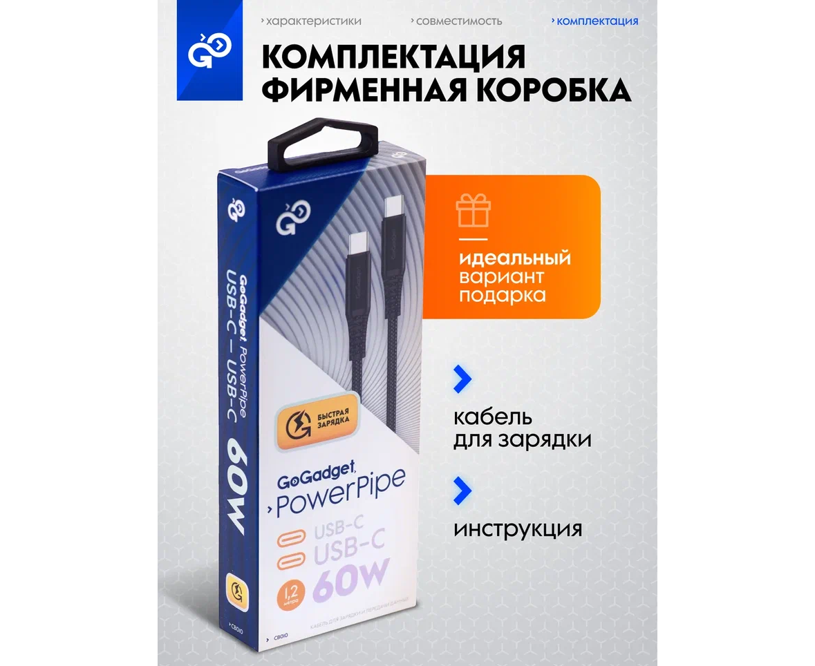 Кабель GoGadget USB-C/USB-С, до 60Вт, 3А, 1,2 м Нейлон, Черный