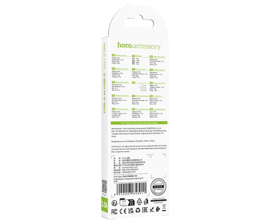 Кабель HOCO X120/ USB Type-C/ 1m/ 3A/ Белый, (Арт. HC-58911)