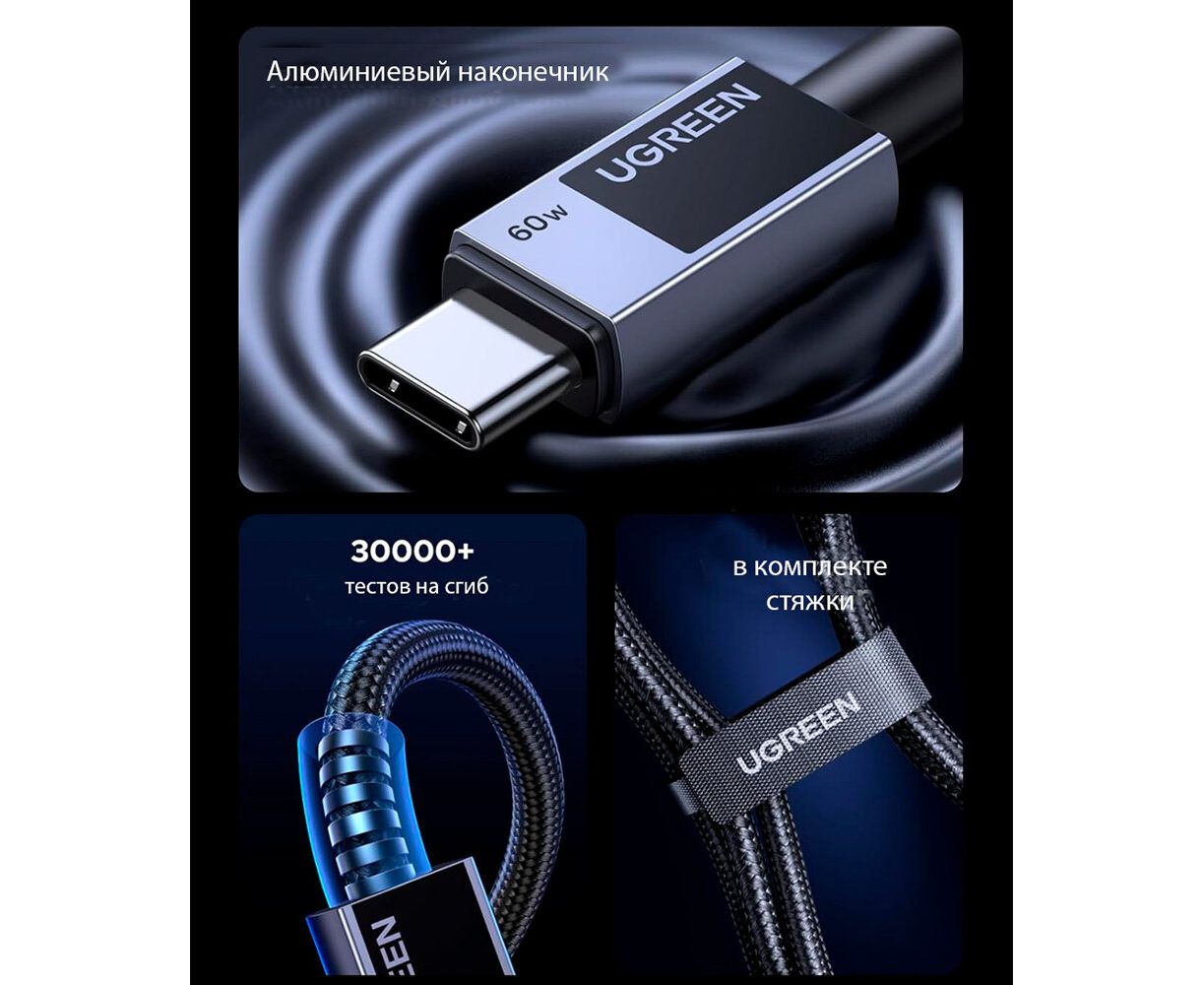 Кабель UGREEN L524 (55776) USB-C to USB-C PD 3A Fast Charging Braided Date Cable 3m Space Gray