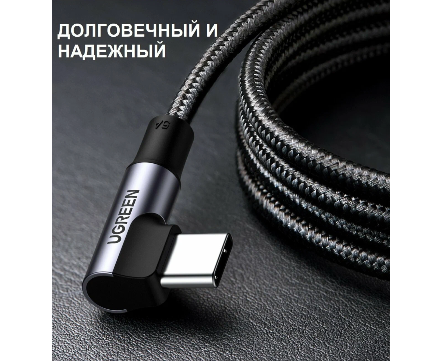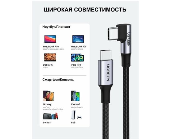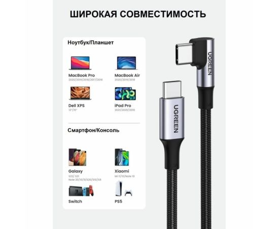 Кабель UGREEN US334 (70645) USB-C 2.0 Male To Angled 90° USB-C 2.0 Male 5A 2m - Black