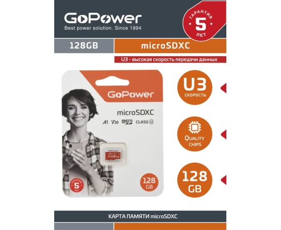 Карта памяти GoPower 00-00025683 microSD 128GB Class10 UHS-I (U3) 100 МБ/сек V30 без адаптера