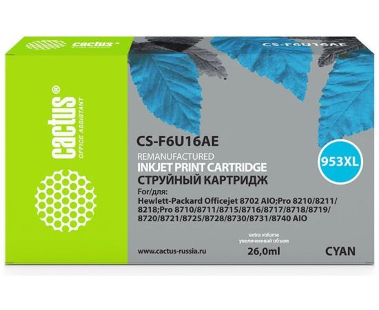 Картридж Cactus CS-F6U16AE №953XL для HP OJ Pro 7740/8210/8218/8710/8715, голубой, 26 мл.