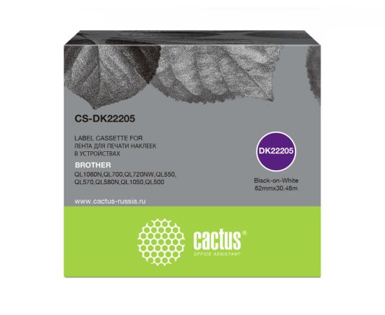 Картридж ленточный Cactus CS-DK22205: непрерывная бумажная лента 62 мм х 30,48 м, белая. Бумажные наклейки подходят для маркировки различных изделий и упаковки. С их помощью можно создавать этикетки с логотипом, штрих-кодом, бейджи для посетителей или почтовые наклейки для доставки. Широкая сфера применения: дома, в офисе, на производстве.